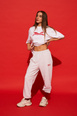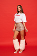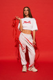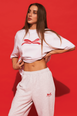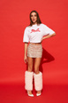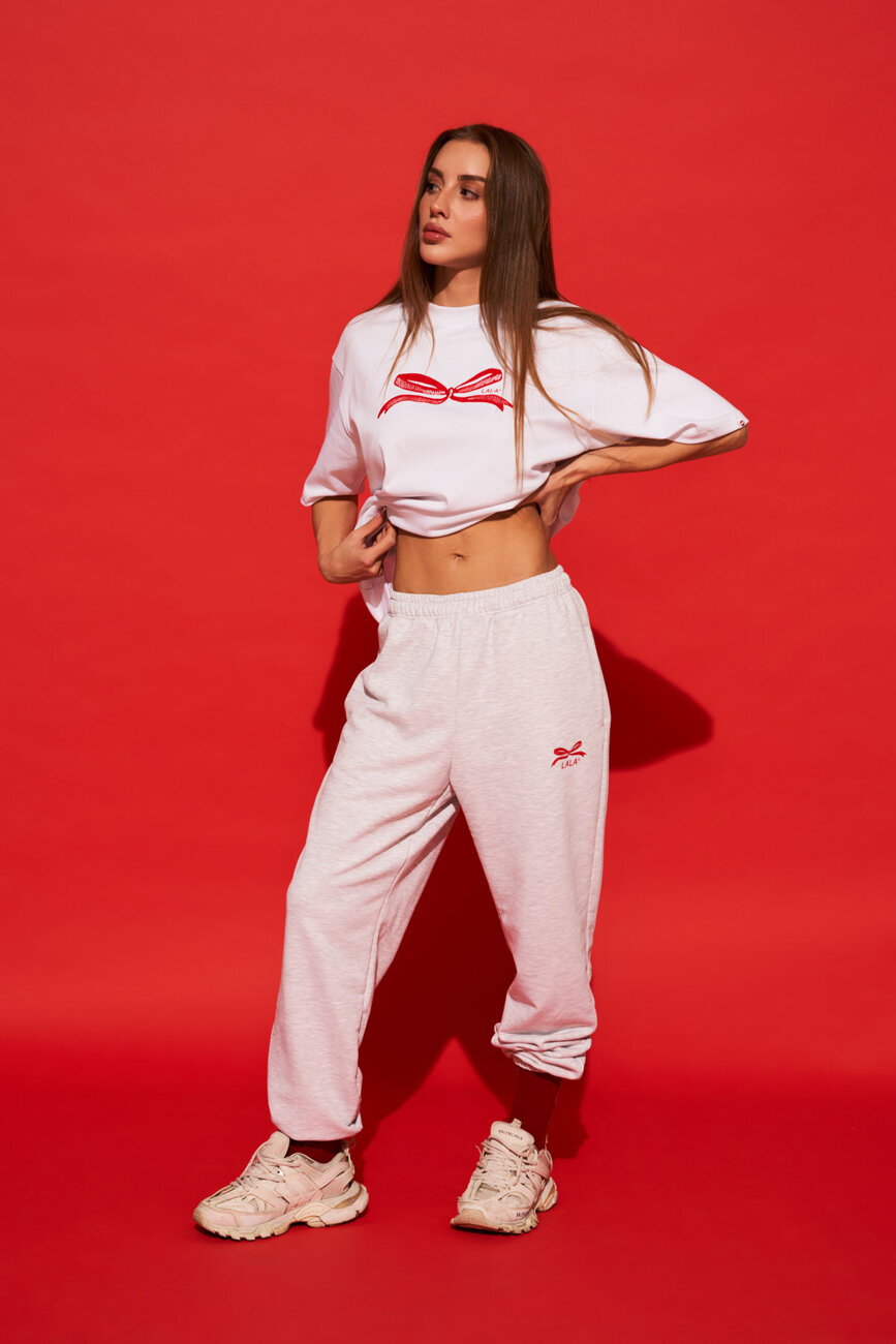 Biała koszulka o kroju BFF, inspirowanym swobodnym stylem oversize. Na przodzie nadrukowano subtelną grafikę w kształcie świątecznej wstążki, uzupełnioną o małe logo LALA.