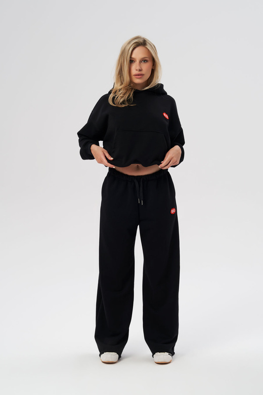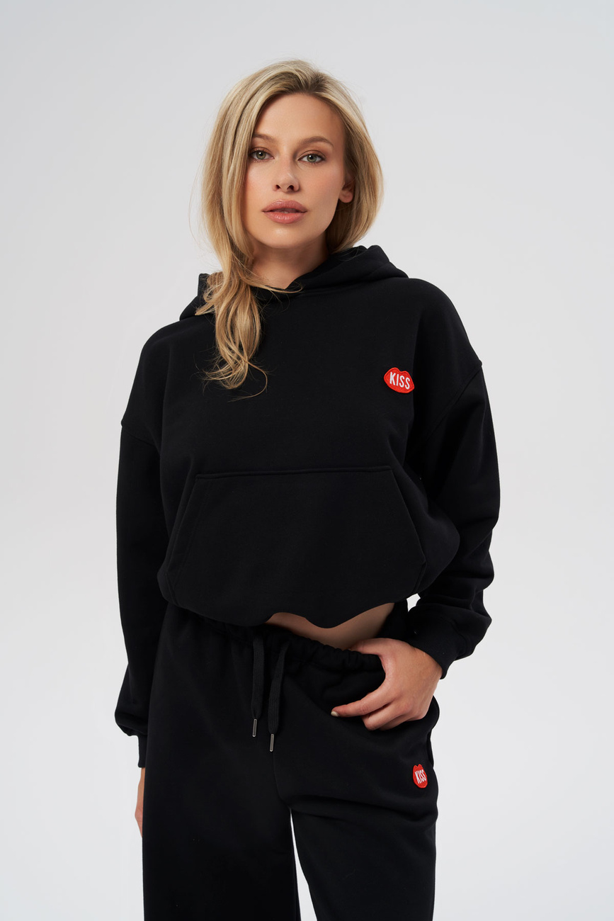 Uszyta z czarnej dresówki z naszywką firmową KISS™️ na piersi w kształcie ust czerwonych jak jesienne jabłka.