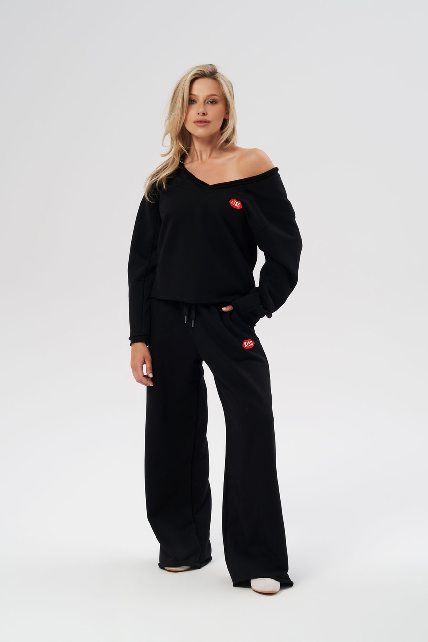 Czarne spodnie o szerokim dzwonów, uszyte z dresówki tworzą parę idealną z naszą najnowszą bluzą z dekoltem w szpic.