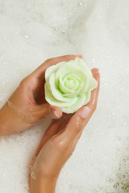 Glicerynowe mydło w kształcie róży - zielona herbata i cytrynowa świeżość w eleganckiej formie natury.