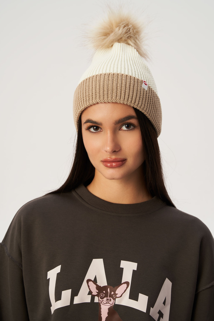 Czapka jest w tonacji beżowej z dwukolorowej wełny i ozdobiona jest naszytą małą meteczką żakardową LALA Lips.