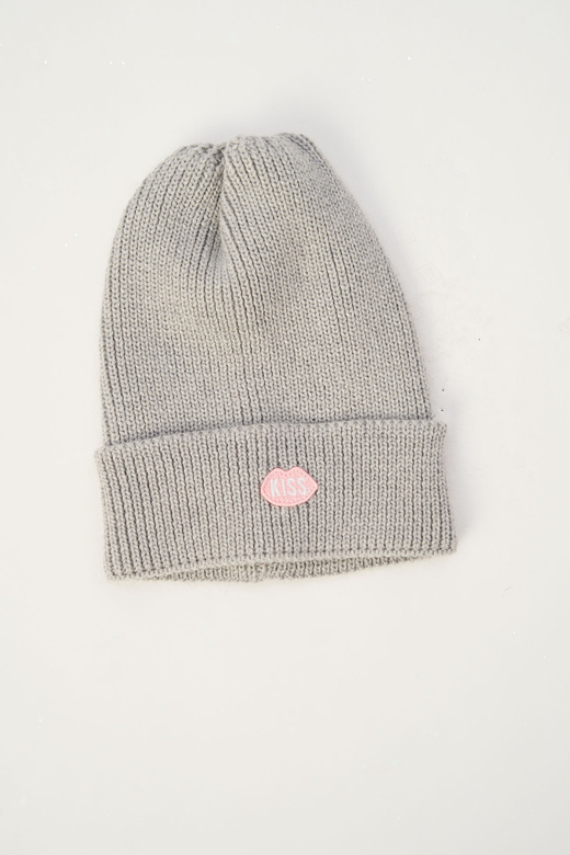 Czapka jest w kolorze szarym i ozdobiona jest naszytą małą różową naszywką KISS w kształcie ust.