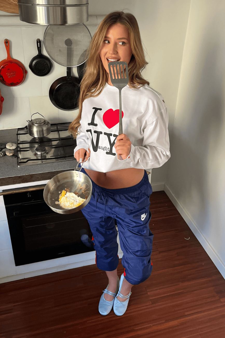 Bluzka longsleeve LALA z hasłem I LOVE NaughtY to nowy codzienny basic z wyraźnym charakterem. Biała, luźna i minimalistyczna w formie, ale z mocnym nadrukiem, który przyciąga uwagę i nadaje całości przekorny vibe.